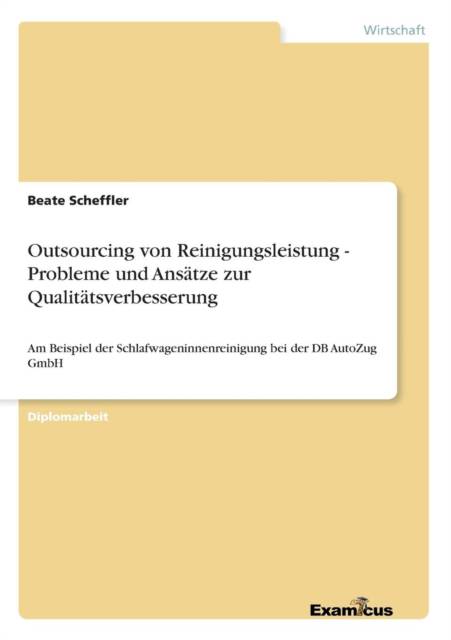 Diplomarbeit aus dem Jahr 2006 im Fachbereich BWL - Unternehmensführung, Management, Organisation, Note: 2.3, AKAD Fachhochschule Stuttgart, Sprache: Deutsch, Abstract: Die Reinigungsleistung in den Nachtverkehrszügen wird im Rahmen einer Outsourcing-Partnerschaft erstellt. Im Auftrag der DB AutoZug GmbH analysiert die Autorin im Kern der Arbeit bestehende Probleme dieser Outsourcing-Beziehung und zeigt Handlungsmöglichkeiten zur Qualitätsverbesserung der Reinigungsleistung auf. Die Schlafwageninnenreinigung steht dabei in einem besonderen Blickwinkel, weil sie aufgrund ihrer spezifischen Anforderungen und hohen Kundenrelevanz sowohl für das auslagernde Unternehmen als auch für den Auftragnehmer bedeutend ist.