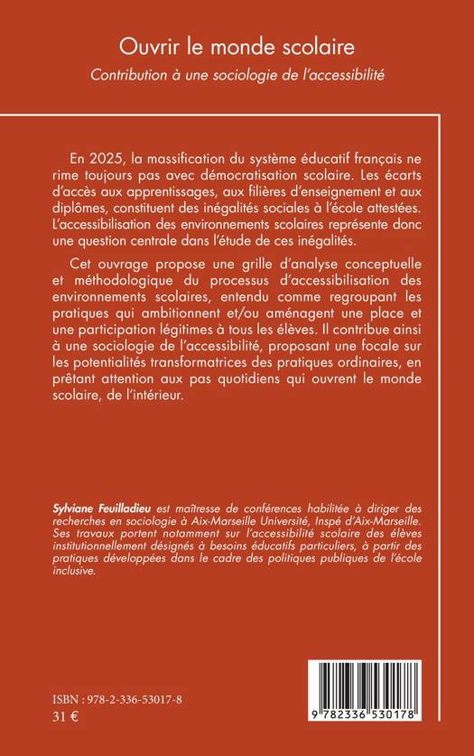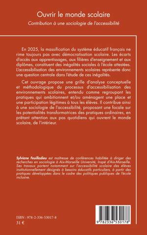 En 2025, la massification du système éducatif français ne rime toujours pas avec démocratisation scolaire. Les écarts d'accès aux apprentissages, aux filières d'enseignement et aux diplômes, constituent des inégalités sociales à l'école attestées. L'accessibilisation des environnements scolaires représente donc une question centrale dans l'étude de ces inégalités. Cet ouvrage propose une grille d'analyse conceptuelle et méthodologique du processus d'accessibilisation des environnements scolaires, entendu comme regroupant les pratiques qui ambitionnent et/ou aménagent une place et une participation légitimes à tous les élèves. Il contribue ainsi à une sociologie de l'accessibilité, proposant une focale sur les potentialités transformatrices des pratiques ordinaires, en prêtant attention aux pas quotidiens qui ouvrent le monde scolaire, de l'intérieur.