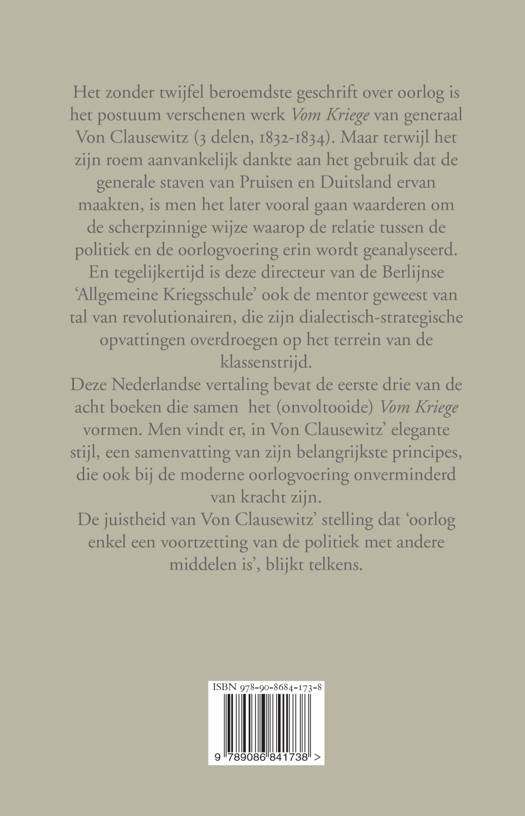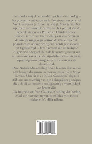 Deze Nederlandse vertaling bevat de eerste drie van de acht boeken die samen het (onvoltooide) Vom Kriege vormen. Men vindt er, in Von Clausewitz’ elegante stijl, een samenvatting van zijn belangrijkste principes, die ook bij de moderne oorlogvoering onverminderd van kracht zijn.