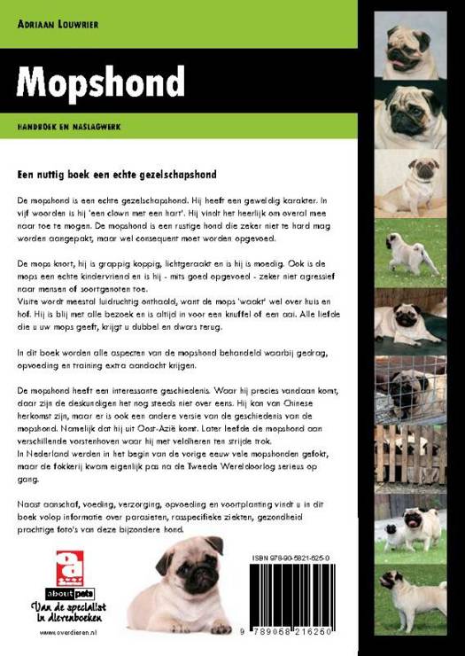 De mopshond is een echte gezelschapshond. Hij heeft een geweldig karakter. In vijf woorden is hij een 'een clown met een hart'. Hij vindt het heerlijk om overal mee naar toe te mogen. De mopshond is een rustige hond die zeker niet te hard mag worden aangepakt, maar wel consequent moet worden opgevoed. De mops knort, hij is grappig koppig, lichtgeraakt en hij is moedig. Ook is de mops een echte kindervriend en is hij - mits goed opgevoed - zeker niet agressief naar mensen of soortgenoten toe. Visite wordt meestal luidruchtig onthaald, want de mops 'waakt' wel over huis en hof. Hij is blij met alle bezoek en is altijd in voor een knuffel of een aai. Alle liefde die u uw mops geeft, krijgt u dubbel en dwars terug. In dit boek worden alle aspecten van de mopshond behandeld waarbij gedrag, opvoeding en training extra aandacht krijgen. De mopshond heeft een interessante geschiedenis, Waar hij precies vandaan komt, daar zijn de deskundigen het nog steeds niet over eens. Hij kan van Chinese herkomst zijn, maar er is ook een andere versie van de geschiedenis van de mopshond. Namelijk dat hij uit Oost-Azië komt. Later leefde de mopshond aan verschillende vorstenhoven waar hij met veldheren ten strijde trok. In Nederland werden in het begin van de vorige eeuw vele mopshonden gefokt, maar de fokkerij kwam eigenlijk pas na de Tweede Wereldoorlog serieus op gang. Naast aanschaf, voeding, verzorging, opvoeding en voortplanting vindt u in dit boek volop informatie over parasieten, rasspecifieke ziekten, gezondheid en prachtige foto's van deze bijzondere hond.