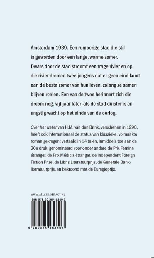 1939, Amsterdam, een rumoerige stad die stil is geworden door een lange, warme zomer. Dwars door de stad stroomt een trage rivier, en op die rivier dromen twee jongens dat er geen eind komt aan de beste zomer van hun leven, zolang ze samen blijven roeien. Een van de twee herinnert zich die droom nog, vijf jaar later, als de stad duister is en angstig wacht op het einde van de oorlog. Over het water heeft inmiddels ook internationaal de status van klassieke, volmaakte roman gekregen: vertaald in 14 talen, inmiddels toe aan de 20e druk, genomineerd voor onder andere de Prix Femina étranger, de Prix Médicis étranger, de Independent Foreign Fiction Prize, de Libris Literatuurprijs, de Generale Bankliteratuurprijs, en bekroond met de Euregioprijs.