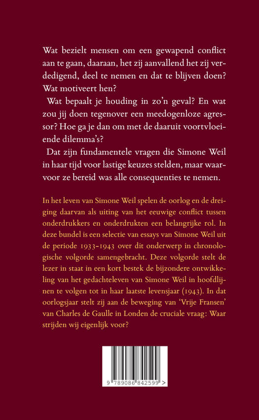 In het leven van Simone Weil spelen de oorlog en de dreiging daarvan als uiting van het eeuwige conflict tussen onderdrukkers en onderdrukten een belangrijke rol. In deze bundel is een selectie van essays van Simone Weil uit de periode 1933-1943 over dit onderwerp in chronologische volgorde samengebracht. Deze volgorde stelt de lezer in staat in een kort bestek de bijzondere ontwikkeling van het gedachteleven van Simone Weil in hoofdlijnen te volgen tot in haar laatste levensjaar (1943). In dat oorlogsjaar stelt zij aan de beweging van ‘Vrije Fransen’ van Charles de Gaulle in Londen de cruciale vraag: Waar strijden wij eigenlijk voor?