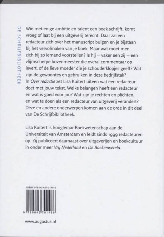Wie alle richtlijnen en adviezen van De Schrijfbibliotheek netjes heeft opgevolgd, zou in staat moeten zijn de ideale tekst te schrijven. Toch valt er nog altijd aan een manuscript te sleutelen om het beter te maken. Veel mensen laten hun teksten door vrienden of bekenden becommentariëren, maar op een dag ligt je manuscript dan eindelijk op de uitgeverij, bij de redacteur. Wat moet je je bij zo iemand voorstellen? Geeft hij, of zij, je bemoedigende schouderklopjes, of is het een vlijmscherpe bovenmeester die overal commentaar bij heeft? Lisa Kuitert zet uiteen wat een redacteur doet met jouw tekst. Welke belangen heeft een redacteur, en wat is goed voor jou? Wat zijn je rechten en plichten, en wat te doen als een redacteur van uitgeverij verandert? Deze en andere onderwerpen komen in 'Over redactie' aan de orde.