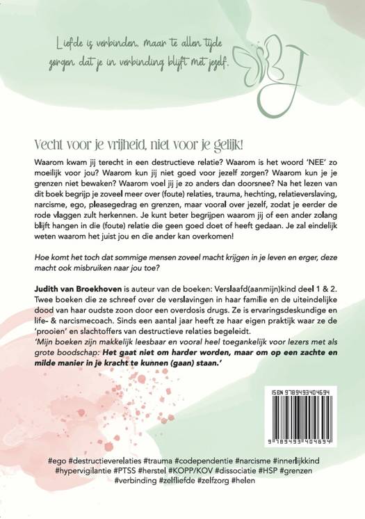 Vecht voor je vrijheid, niet voor je gelijk! Waarom kwam jij terecht in een destructieve relatie? Waarom is het woord ‘NEE’ zo moeilijk voor jou? Waarom kun jij niet goed voor jezelf zorgen? Waarom kun je je grenzen niet bewaken? Waarom voel jij je zo anders dan doorsnee? Na het lezen van dit boek begrijp je zoveel meer over (foute) relaties, trauma, hechting, relatieverslaving, narcisme, ego, pleasegedrag en grenzen, maar vooral over jezelf, zodat je eerder de rode vlaggen zult herkennen. Je kunt beter begrijpen waarom jij of een ander zolang blijft hangen in die (foute) relatie die geen goed doet of heeft gedaan. Je zal eindelijk weten waarom het juist jou en die ander kan overkomen!