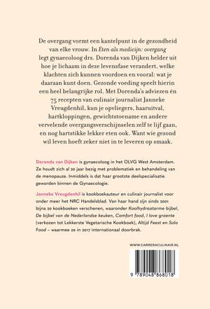 In Eten als medicijn: overgang legt gynaecoloog dr. Dorenda van Dijken uit wat je zelf kunt doen om gezond ouder te worden en welke rol voeding hierbij speelt - ook als je wel degelijk last hebt van overgangsklachten. Met de 75 recepten van Janneke Vreugdenhil kun je iedere dag, de hele dag door, lekker eten. Want wie gezond wil leven, hoeft zeker niet in te leveren op smaak.
