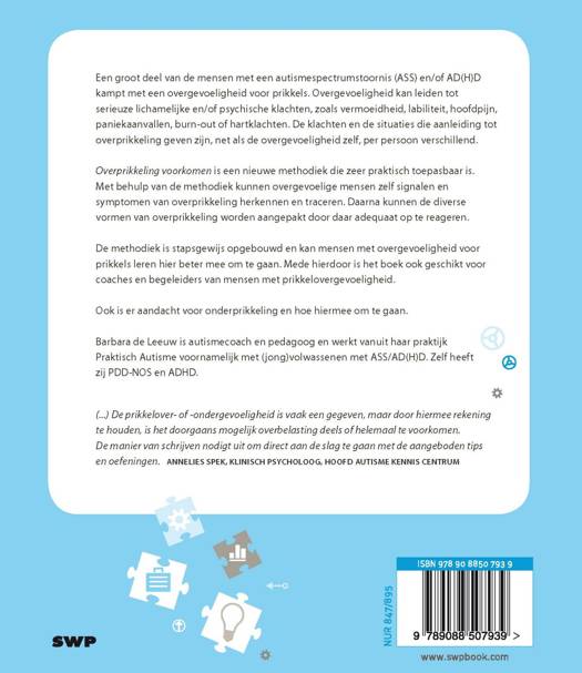 In deze 4e druk is nu ook extra aandacht voor onderprikkeling en hoe hiermee om te gaan.Een groot deel van de mensen met een autismespectrumstoornis (ASS) en/of AD(H)D kampen gedurende hun hele leven met een overgevoeligheid voor prikkels. Overgevoeligheid kan leiden tot serieuze lichamelijke en/of psychische klachten, zoals vermoeidheid, labiliteit, hoofdpijn, paniekaanvallen en in ergere gevallen burn-out of hartklachten. Welke klachten dat zijn en welke situaties aanleiding tot overprikkeling geven, is, net als de overgevoeligheid zelf, per persoon verschillend.Overprikkeling voorkomen is een nieuwe methodiek die zeer praktisch toepasbaar is. Met behulp van de methodiek kunnen overgevoelige mensen zelf signalen en symptomen van overprikkeling herkennen en traceren. Daarna kunnen de diverse vormen van overprikkeling worden aangepakt door daar adequaat op te reageren.De methodiek is stapsgewijs opgebouwd en kan mensen met overgevoeligheid voor prikkels leren hier beter mee om te gaan. Uiteraard is dit boek ook zeer geschikt voor coaches en begeleiders die mensen extra goed kunnen helpen beter om te gaan met hun overprikkelende klachten en reacties.Barbara de Leeuw is autismecoach en pedagoog en werkt vanuit haar praktijk Praktisch Autisme voornamelijk met (jong)volwassenen met ASS/AD(H)D. Zelf heeft zij PDD-NOS en ADHD.