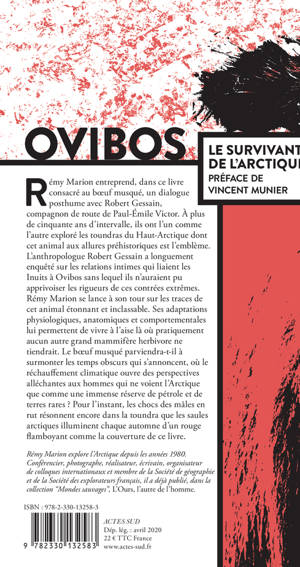 Rémy Marion entreprend, dans ce livre consacré au boeuf musqué, un dialogue posthume avec Robert Gessain, compagnon de route de Paul- Émile Victor. À plus de cinquante ans d'intervalle, ils ont l'un comme l'autre exploré les toundras du Haut-Arctique dont cet animal aux allures préhistoriques est l'emblème. L'anthropologue Robert Gessain a longuement enquêté sur les relations intimes qui liaient les Inuits à Ovibos sans lequel ils n'auraient pu apprivoiser les rigueurs de ces contrées extrêmes. Rémy Marion se lance à son tour sur les traces de cet animal étonnant et inclassable. Ses adaptations physiologiques, anatomiques et comportementales lui permettent de vivre à l'aise là où pratiquement aucun autre grand mammifère herbivore ne tiendrait. Le boeuf musqué parviendra-t-il à surmonter les temps obscurs qui s'annoncent, où le réchauffement climatique ouvre des perspectives alléchantes aux hommes qui ne voient l'Arctique que comme une immense réserve de pétrole et de terres rares ? Pour l'instant, les chocs des mâles en rut résonnent encore dans la toundra que les saules arctiques illuminent chaque automne d'un rouge flamboyant comme la couverture de ce livre
