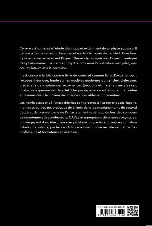 Ce livre est consacré à l'étude théorique et expérimentale de l'oxydoréduction en phase aqueuse. Il traite à la fois des aspects chimiques et électrochimiques du transfert d'électron. Il présente successivement l'aspect thermodynamique puis l'aspect cinétique des phénomènes. Le dernier chapitre concerne l'application aux piles, aux accumulateurs et à la corrosion. Il est conçu à la fois comme livre de cours et comme livre d'expériences : l'exposé théorique, fondé sur les modèles modernes du transfert d'électron, précède la description des expériences. Celles-ci sont ensuite interprétées et commentées à la lumière des théories préalablement présentées. Les nombreuses expériences décrites sont propres à illustrer exposés, leçons ou montages de chimie dans les enseignement de second degré et du premier cycle de l'enseignement supérieur, ou lors des concours de recrutement de professeurs, C.A.P.E.S. et agrégations de sciences physiques. L'ouvrage peut donc être utilisé avec profit à la fois par les étudiants en formation initiale ou continue, par les candidats aux concours de recrutement et par les professeurs et formateurs en exercice.