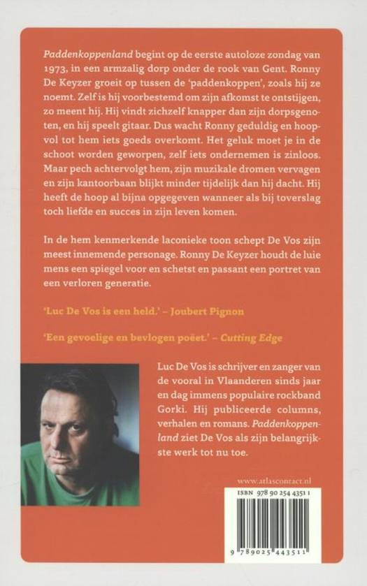 Paddenkoppenland begint op de eerste autoloze zondag van 1973, in een armzalig dorp onder de rook van Gent. Ronny De Keyzer groeit op tussen de 'paddenkoppen', zoals hij ze noemt. Zelf is hij voorbestemd om zijn afkomst te ontstijgen, zo meent hij. Hij vindt zichzelf knapper dan zijn dorpsgenoten, en hij speelt gitaar. Dus wacht Ronny geduldig en hoopvol tot hem iets goeds overkomt. Het geluk moet je in de schoot worden geworpen, zelf iets ondernemen is zinloos. Maar pech achtervolgt hem, zijn muzikale dromen vervagen en zijn kantoorbaan blijkt minder tijdelijk dan hij dacht. Hij heeft de hoop al bijna opgegeven wanneer als bij toverslag toch liefde en succes in zijn leven komen.