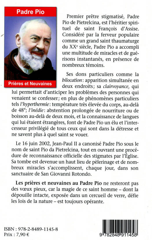 Premier prêtre stigmatisé, Padre Pio de Pietrelcina, est l'héritier spirituel de saint François d'Assise. Considéré par la ferveur populaire comme un grand saint thaumaturge du XXe siècle, Padre Pio a accompli une multitude de miracles et de guérisons instantanés, en présence de nombreux témoins. Ses dons particuliers comme la bilocation : apparition simultanée en deux endroits ; sa clairvoyance, qui lui permettait d'anticiper les problèmes des personnes qui venaient se confesser ; en plus de phénomènes particuliers tels l'hyperthermie : température très élevée du corps, au-delà de 48° ; l'inédie : abstention prolongée de nourriture ou de boisson au-delà de deux mois, et la connaissance de langues qui lui étaient étrangères, font de Padre Pio un élu et l'intercesseur privilégié de tous ceux qui sont dans la détresse et ne savent plus à quel saint se vouer. Le 16 juin 2002, Jean-Paul II a canonisé Padre Pio sous le nom de saint Pio da Pietrelcina, tout en ouvrant une procédure de reconnaissance officielle des stigmates par l'Eglise. Sa tombe est devenue un haut lieu de pèlerinage et de nombreux miracles s'accomplissent, chaque jour, dans son sanctuaire de San Giovanni Rotondo. Les prières et neuvaines au Padre Pio ne resteront pas des voeux pieux, car la magie de ce saint homme - dont la dépouille intacte, exposée dans un cercueil de verre, défie les lois de la nature - est toujours opérante.