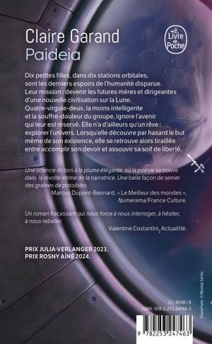 Dix petites filles dans dix stations en orbite autour de la Lune sont les derniers espoirs de l’humanité, morte sur une Terre empoisonnée. Parce que l’une d’elles rêve d’arpenter les planètes, qu’elle est le souffre-douleur des autres, elle relève un défi stupide et découvre ce qu’on leur cache : leur destin de mères des futurs Terriens dans le village lunaire en construction. Seule contre l’univers, elle refuse cet avenir qu’on lui a assigné. Aussi enragée que touchante, elle ira jusqu’au bout.