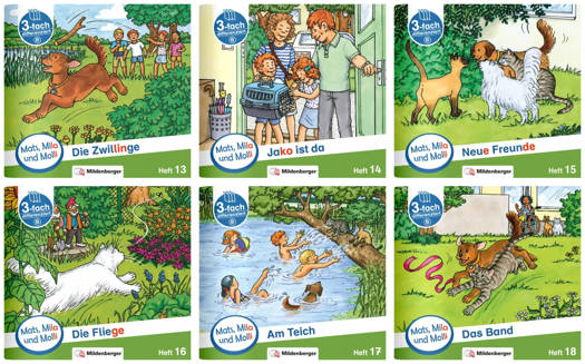 Alle Kinder lernen die gleiche Geschichte kennen. Jedes Kind kann die Geschichte entsprechend seiner Fähigkeiten (Schwierigkeitsstufe A, B oder C) erlesen. Anschließend können alle Kinder gemeinsam über diese eine Geschichte sprechen und diskutieren.Die unterschiedlichen Zugänge zu den sechs Fortsetzungsgeschichten führen zu einem gemeinsamen Erlebnis. Der Inhalt stiftet Gemeinsamkeit. Kein Kind muss allein zurück bleiben. Im Laufe der Zeit kann jedes Kind sich an den drei Schwierigkeitsstufen der Geschichten versuchen. So wird Lernfortschritt ganz praktisch erfahrbar. Das spornt an und macht Mut.Mats, Mila und Molli ist mehr als nur eine didaktisch-sinnvolle Lesereihe in drei verschiedenen Schwierigkeitsstufen. Sympathische Figuren, Alltagsabenteuer und unaufdringlich vermittelte Werte wie Freundschaft und Empathie sind das Rezept für den Erfolg dieser Reihe.In Heft 1 bis 6 lernen sich die Kinder Mats und Mila kennen und ein kleiner Hund namens Molli wird von Mats' Familie adoptiert.Heft 7 bis 12 zeigt spannende Facetten des Alltags mit einem jungen Hund: Warum verschleppt Molli Socken in sein Körbchen? Wie kann man ihn aus¬tricksen, dass er seine Pille schluckt? Mit einem Welpen gibt es immer etwas zu erleben.Heft 13 bis 18 steht ganz unter dem Motto: "Neue Freunde, neue Abenteuer": Der Freundeskreis von Mats und Mila erweitert sich und auch Hund Molli bekommt neue Spielgefährten in Form von drei Katzen.-Heft 13: Die Zwillinge-Heft 14: Jako ist da-Heft 15: Neue Freunde-Heft 16: Die Fliege-Heft 17: Am Teich-Heft 18: Das BandSchwierigkeitsstufe BTypografische Mittel - Einfach (Standard):-Silbenmarkierung-Fibel-Schrift-keine zeilenübergreifenden Sätze-farbige Illustrationen zu jeder TextseiteSprachliche Mittel-einige Attributergänzungen-kurze Begleitsätze zur wörtlichen Rede-kurze, erweiterte Sätze - eine fortlaufende Geschichte wird erzählt