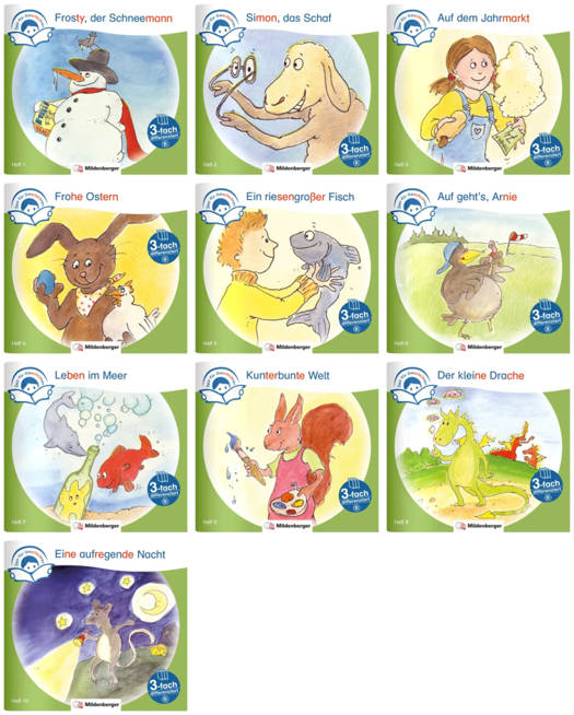 Der beliebte Klassiker neu aufgelegt und didaktisch überarbeitet. Zeit für Geschichten gibt es jetzt 3-fach differenziert. Das Textniveau der überarbeiteten Klassik-Ausgabe ist die neue Schwierigkeitsstufe C. Durch die Differenzierung kann jeder Leser auf seinem Niveau sich selbst ein Büchlein erlesen und nach und nach an den höheren Schwierigkeitsstufen versuchen. So wird Lernfortschritt sichtbar.-Heft 1: Frosty, der Schneemann-Heft 2: Simon, das Schaf-Heft 3: Auf dem Jahrmarkt-Heft 4: Frohe Ostern-Heft 5: Ein riesengroßer Fisch-Heft 6: Auf gehts, Arnie-Heft 7: Leben im Meer-Heft 8: Kunterbunte Welt-Heft 9: Der kleine Drache-Heft 10: Eine aufregende NachtSchwierigkeitsstufe B:Typografische Mittel - Einfach (Standard):-Silbenmarkierung-Fibelschrift-keine zeilenübergreifenden SätzeSprachliche Mittel-einige Attributergänzungen-kurze Begleitsätze zur wörtlichen Rede-kurze, erweiterte Sätze - eine fortlaufende Geschichte wird erzählt