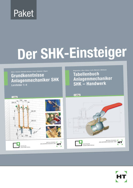 Das Paket Der SHK-Einsteiger enthält die Titel- "Grundkenntnisse Anlagenmechaniker SHK Lernfelder 1-4" (ISBN978-3-582-28171-5) und- "Tabellenbuch Anlagenmechaniker SHK - Handwerk" (ISBN 978-3-582-65074-0)