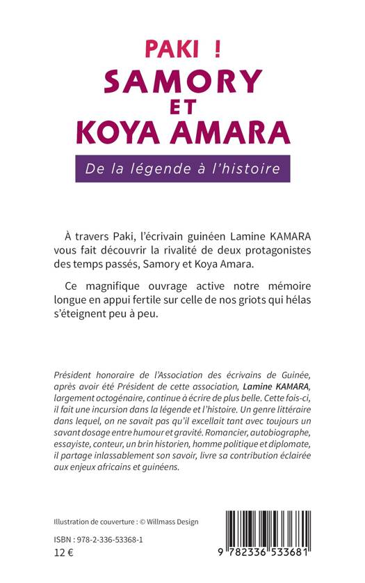 À travers Paki, l'écrivain guinéen Lamine KAMARA vous fait découvrir la rivalité de deux protagonistes des temps passés, Samory et Koya Amara. Ce magnifique ouvrage active notre mémoire longue en appui fertile sur celle de nos griots qui hélas s'éteignent peu à peu.