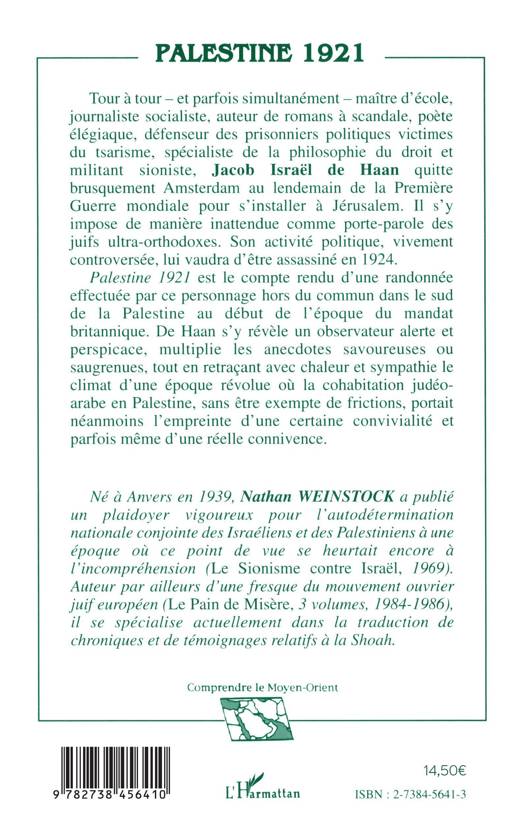 Tour à tour - et parfois simultanément - maître d'école, journaliste socialiste, auteur de romans à scandale, poète élégiaque, défenseur des prisonniers politiques victimes du tsarisme, spécialiste de la philosophie du droit et militant sioniste, Jacob Israël de Haan quitte brusquement Amsterdam au lendemain de la Première Guerre mondiale pour s'installer à Jérusalem. Il s'y impose de manière inattendue comme porte-parole des juifs ultra-orthodoxes. Son activité politique, vivement controversée, lui vaudra d'être assassiné en 1924. Palestine 1921 est le compte rendu d'une randonnée effectuée par ce personnage hors du commun dans le sud de la Palestine au début de l'époque du mandat britannique. De Haan s'y révèle un observateur alerte et perspicace, multiplie les anecdotes savoureuses ou saugrenues, tout en retraçant avec chaleur et sympathie le climat d'une époque révolue où la cohabitation judéoarabe en Palestine, sans être exempte de frictions, portait néanmoins l'empreinte d'une certaine convivialité et parfois même d'une réelle connivence.