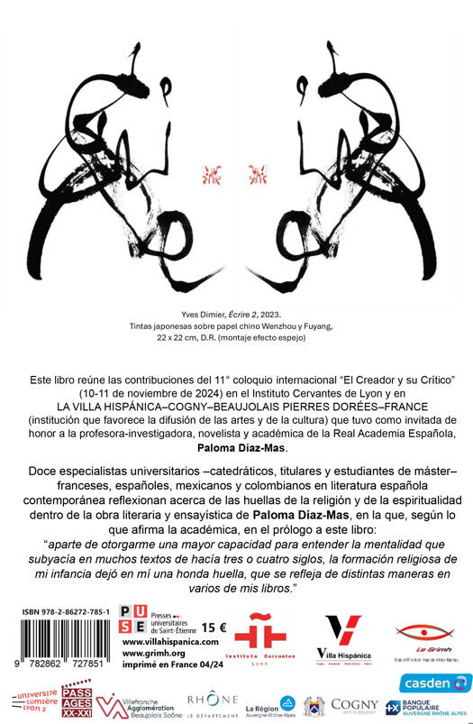 L’ouvrage réunit les contributions au 11e colloque international « Le créateur et sa critique » (tenu en novembre 2023) à l’Instituto Cervantes de Lyon, et la Villa Hispánica, Cogny, Beaujolais Pierres dorées, France, en collaboration avec l’Université Lumière Lyon 2 et le laboratoire Passages XX-XXI. Invitée à l’honneur : l’académicienne, romancière et professeure des Universités Paloma Díaz-Mas. Le livre s’articule autour de l’études des grandes idées développées dans l’œuvre de cette académicienne et en particulier celle de la religion, mais aussi des croyances, de la famille, de l’écriture, de la bonté, de l’apprentissage, de la jeunesse…