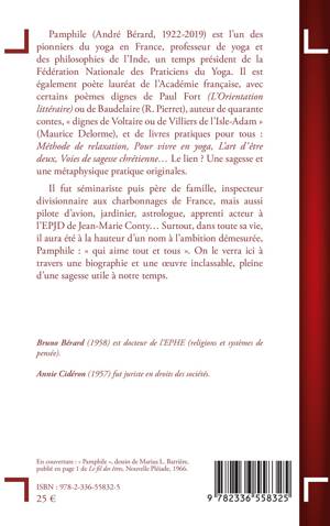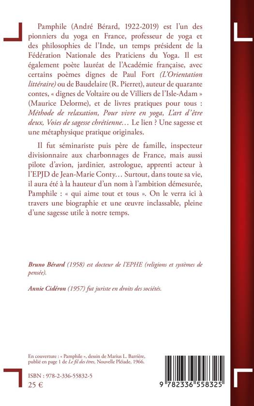 Pamphile (André Bérard, 1922-2019) est l’un des pionniers du yoga en France, professeur de yoga et des philosophies de l’Inde, un temps président de la Fédération Nationale des Praticiens du Yoga. Il est également poète lauréat de l’Académie française, avec certains poèmes dignes de Paul Fort (L’Orientation littéraire) ou de Baudelaire (R. Pierret), auteur de quarante contes, « dignes de Voltaire ou de Villiers de l’Isle-Adam » (Maurice Delorme), et de livres pratiques pour tous : Méthode de relaxation, Pour vivre en yoga, L’art d’être deux, Voies de sagesse chrétienne… Le lien ? Une sagesse et une métaphysique pratique originales. Il fut séminariste puis père de famille, inspecteur divisionnaire aux charbonnages de France, mais aussi pilote d’avion, jardinier, astrologue, apprenti acteur à l’EPJD de Jean-Marie Conty… Surtout, dans toute sa vie, il aura été à la hauteur d’un nom à l’ambition démesurée, Pamphile : « qui aime tout et tous ». On le verra ici à travers une biographie et une œuvre inclassable, pleine d’une sagesse utile à notre temps.
