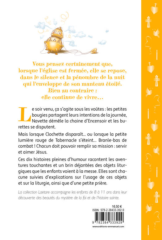 Vous pensez certainement que, lorsque l’église est fermée, elle se repose, dans le silence et la pénombre de la nuit qui l’enveloppe de son manteau étoilé. Bien au contraire : elle continue de vivre… Le soir venu, ça s’agite sous les voûtes : les petites bougies partagent leurs intentions de la journée, Navette démêle la chaine d’Encensoir et les burettes se disputent. Mais lorsque Clochette disparaît... ou lorsque la petite lumière rouge du tabernacle s’éteint… Branle-bas de combat ! Chacun doit pouvoir remplir sa mission : servir et aimer Jésus. Ces dix histoires pleines d’humour racontent les aventures touchantes et un brin déjantées des objets liturgiques que les enfants voient à la messe. Elles sont chacune suivies d’explications sur l’usage de ces objets et sur la liturgie, ainsi que d’une petite prière. La collection Laetare accompagne les enfants de 8 à 11 ans dans leur découverte des beautés du mystère de la foi et de l’histoire sainte.