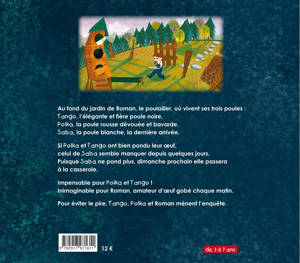 Au fond du jardin de Roman, le poulailler, où vivent ses trois poules : Tango, l'élégante et fière poule noire Polka, la poule rousse dévouée et bavarde Salsa, la poule blanche, la dernière arrivée. Si Polka et Tango ont bien pondu leur uf, celui de Salsa semble manquer depuis quelques jours. Puisque Salsa ne pond plus, elle sera servie en poule au pot, dimanche prochain. Impensable pour Polka et Tango ! Inimaginable pour Roman, amateur d'uf gobé chaque matin. En fait Salsa continue de pondre son uf mais il disparaît. Pourquoi, comment ? Tango et Polka et Roman mènent l'enquête. Une histoire qui finit bien puisque la solidarité entre poules fait merveille, le trio Tango-Polka-Salsa continueront de vivre des jours heureux dans le poulailler de Roman.