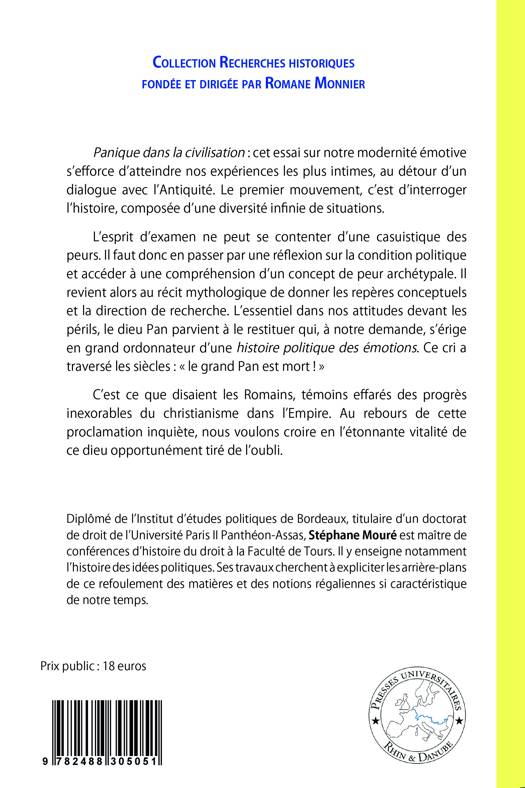 Panique dans la civilisation : cet essai sur notre modernité émotive s’efforce d’atteindre nos expériences les plus intimes, au détour d’un dialogue avec l’Antiquité. Le premier mouvement, c’est d’interroger l’histoire, composée d’une diversité infinie de situations. L’esprit d’examen ne peut se contenter d’une casuistique des peurs. Il faut donc en passer par une réflexion sur la condition politique et accéder à une compréhension d’un concept de peur archétypale. Il revient alors au récit mythologique de donner les repères conceptuels et la direction de recherche. L’essentiel dans nos attitudes devant les périls, le dieu Pan parvient à le restituer qui, à notre demande, s’érige en grand ordonnateur d’une histoire politique des émotions. Ce cri a traversé les siècles : « le grand Pan est mort ! » C’est ce que disaient les Romains, témoins effarés des progrès inexorables du christianisme dans l’Empire. Au rebours de cette proclamation inquiète, nous voulons croire en l’étonnante vitalité de ce dieu opportunément tiré de l’oubli.