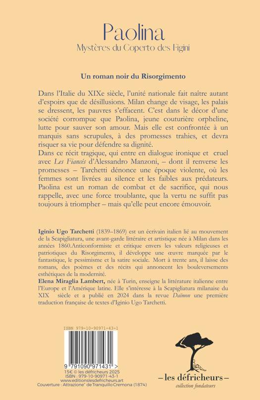 Paolina, roman noir du Risorgimento, s'impose comme une oeuvre majeure et méconnue de la Scapigliatura milanaise, ce courant littéraire de la seconde moitié du XIXe siècle qui rompt avec l'optimisme romantique et le moralisme catholique dominant. Son auteur, Iginio Ugo Tarchetti (1839-1869), y dépeint une Italie nouvellement unifiée, où les promesses de justice sociale, d'émancipation et de vertu collective s'effondrent face à la réalité brutale des rapports de classe et de genre.