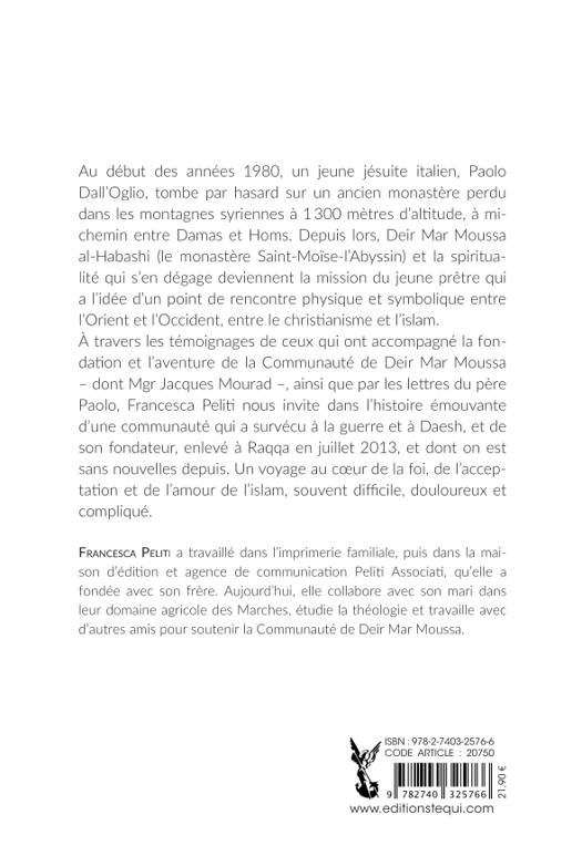 Au début des années 1980, un jeune jésuite italien, Paolo Dall'Oglio, né en 1954, tombe par hasard sur un ancien monastère perdu dans les montagnes syriennes à 1500 mètres d’altitude, à mi-chemin entre Damas et Homs. Depuis 1982, le monastère de Mar Moussa al-Habashi, ou Saint Moïse l’Abyssin, et la spiritualité qui s’en dégage deviennent la mission du jeune homme qui a, en plus de sa vocation, l’idée d’un point de rencontre physique et symbolique entre l’Orient et l’Occident. La vision théologique et spirituelle du Père Paolo a impliqué un grand nombre de personnes, elle les a touchées, changeant le cours de leur vie. C’est à travers les témoignages de tous ces protagonistes – moines, des moniales et des laïcs – que l’auteur raconte un voyage au cœur de la foi, de l’acceptation et de l’amour de l’Islam, un chemin plein d’humanité. On trouvera enfin dans cet ouvrage douze lettres du père Paolo ainsi que le témoignage de sa mère et d’une de ses sœurs. « Je crois au pouvoir de la prière