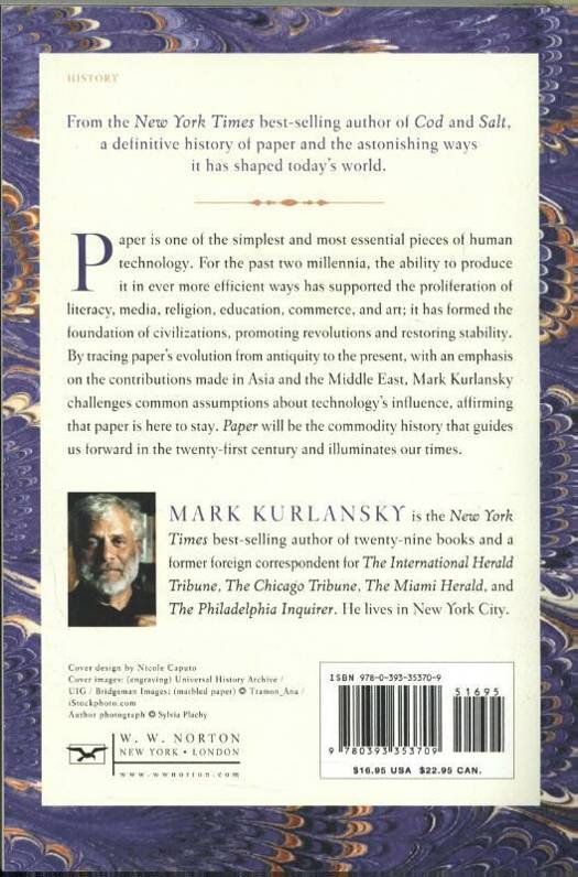 Paper is one of the simplest and most essential pieces of human technology. For the past two millennia, the ability to produce it in ever more efficient ways has supported the proliferation of literacy, media, religion, education, commerce, and art; it has formed the foundation of civilizations, promoting revolutions and restoring stability. By tracing paper's evolution from antiquity to the present, with an emphasis on the contributions made in Asia and the Middle East, Mark Kurlansky challenges common assumptions about technology's influence, affirming that paper is here to stay. Paper will be the commodity history that guides us forward in the twenty-first century and illuminates our times.