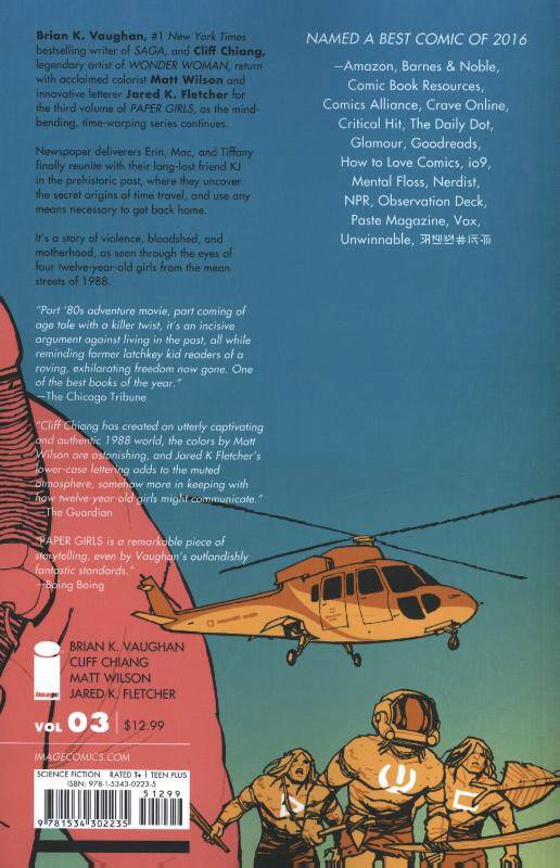 The multiple Eisner and Harvey Award-winning series from BRIAN K. VAUGHAN and CLIFF CHIANG continues, as newspaper deliverers Erin, Mac and Tiffany finally reunite with their long-lost friend KJ in an unexpected new era, where the girls must uncover the secret origins of time travel... or risk never returning home to 1988.
