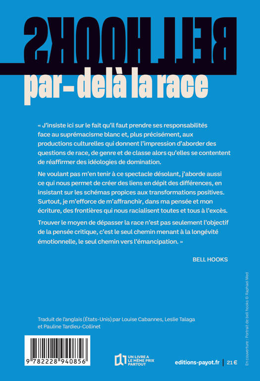 "J'insiste ici sur le fait qu'il faut prendre ses responsabilités face au suprémacisme blanc et, plus précisément, aux productions culturelles qui donnent l'impression d'aborder des questions de race, de genre et de classe alors qu'elles se contentent de réaffirmer des idéologies de domination. Ne voulant pas m'en tenir à ce spectacle désolant, j'aborde aussi ce qui nous permet de créer des liens en dépit des différences, en insistant sur les schémas propices aux transformations positives. Surtout, je m'efforce de m'affranchir, dans ma pensée et mon écriture, des frontières qui nous racialisent toutes et tous à l'excès. Trouver le moyen de dépasser la race n'est pas seulement l'objectif de la pensée critique, c'est le seul chemin menant à la longévité émotionnelle, le seul chemin vers l'émancipation."