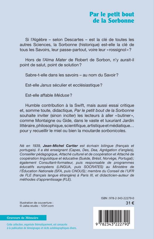 Si l’Algèbre - selon Descartes - est la clé de toutes les autres Sciences, la Sorbonne (historique) est-elle la clé de tous les Savoirs, leur passe-partout, voire leur « rossignol » ? Hors de l’Alma Mater de Robert de Sorbon, n’y aurait-il point de salut, point de solution ? Sabre-t-elle dans les savoirs - au nom du Savoir ? Est-elle Janus séculier et ecclésiastique ? Est-elle affable Méduse ?Humble contribution à la Swift, mais aussi essai critique et, somme toute, didactique, Par le petit bout de la Sorbonne souhaite inviter (sinon inciter) les lecteurs à aller « butiner », comme Montaigne ou Gide, dans le vaste et luxuriant Jardin littéraire, philosophique, scientifique, artistique et médiatique... pour y recueillir le miel ou bien la moutarde sorbonicoles.