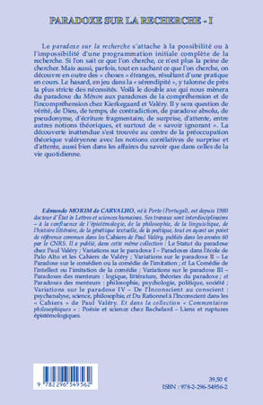 Cette variation sur le paradoxe tourne autour du paradoxe de la recherche - ou comment chercher ce que l'on ignore. Le lecteur sera mené du paradoxe de Ménon aux paradoxes de la compréhension et de l'incompréhension chez Kierkegaard et Valéry. Il y sera question de vérité, de Dieu, de temps, de contradiction, de paradoxe absolu, de pseudonyme, d'écriture fragmentaire, de surprise, d'attente, entre autres notions théoriques, et surtout de "savoir ignorant".