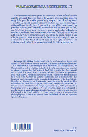Ce volume expose les "dessous" de la recherche telle qu'elle s'inscrit dans les écrits de Valéry, sous certains aspects suggérés par la quête pseudonymique chez Kierkegaard. Il poursuit et complète la réflexion du 1er volume, où l'enjeu du savoir était pris en tant que tel. Ici, on s'intéresse plutôt aux "à-côtés" que la recherche ordinaire a tendance à effacer dans ses oeuvres cachées.