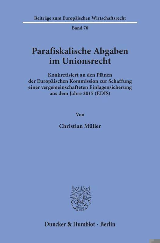Die Rechtmaaigkeitsanforderungen an unionseigene parafiskalische Abgaben im Unionsrecht gelten in der Literatur als in substanziellen Teilen ungeklart. Im Jahre 2015 hat die Europaische Kommission einen Verordnungsentwurf zur Schaffung einer unionalen Einlagensicherung vorgelegt, der in abgabenrechtlicher Hinsicht ohne Klarung dieser Frage in seiner Rechtmaaigkeit nicht abschlieaend beurteilt werden kann. Die Arbeit entwickelt Maastabe aus dem Europaischen Primarrecht und wendet diese im Anschluss auf die vorgeschlagene Abgabenstruktur des European Deposit Insurance Scheme (EDIS) an. Die Maastabe entspringen dabei grundrechtlicher und organisationsrechtlicher, insbesondere kompetenzrechtlicher Natur. Zugleich setzt sich die Arbeit mit der europaischen Abgabensystematik auseinander.