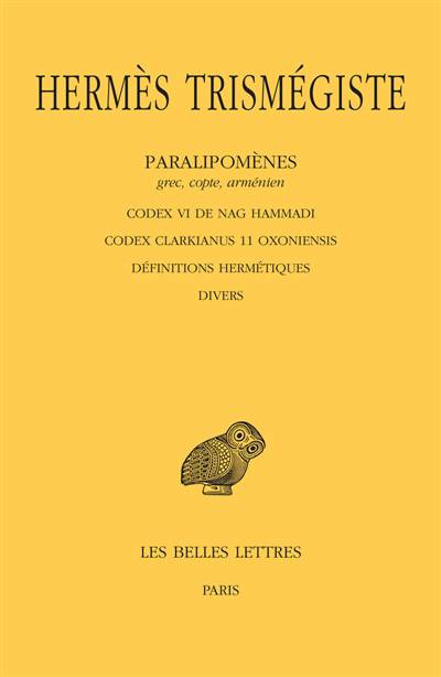 Les textes grecs et latins ont été publiés dans la CUF en 4 volumes, de 1941 à 1954, par A. D. Nock et A.-J. Festugière. Depuis, d’autres témoins ont été découverts, en grec, en copte, en arménien, en syriaque et en arabe. Parmi ces Paralipomènes, se révèlent quelques pierres angulaires de l’édifice hermétique.