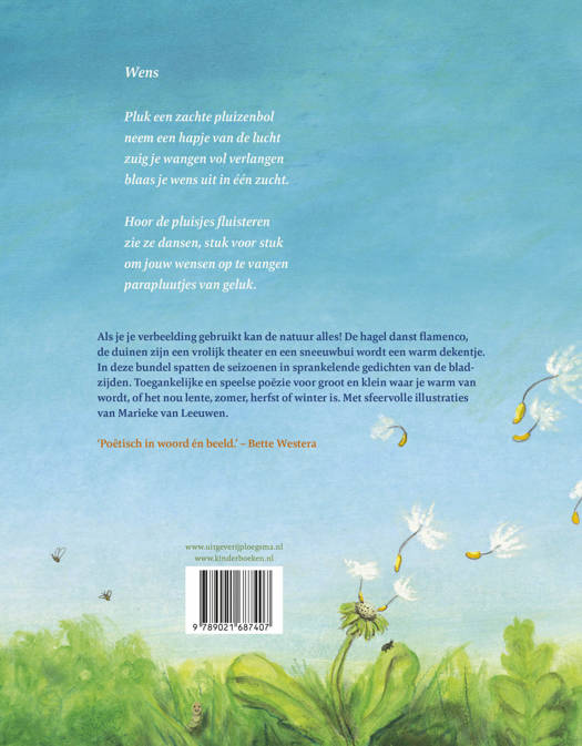 Als je je verbeelding gebruikt kan de natuur alles. De hagel danst flamenco, de duinen zijn een vrolijk theater en een sneeuwbui wordt een warm dekentje. In deze bundel spatten de seizoenen in 25 sprankelende gedichten van de bladzijden. Toegankelijke en speelse poëzie voor groot en klein waar je warm van wordt, of het nou lente, zomer, herfst of winter is.