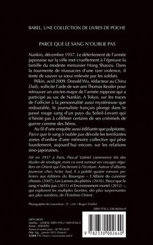 Au fil d'une enquête aussi édifiante que palpitante, «Parce que le sang n'oublie pas» dévoile les terrifiantes zones d'ombre d'une mémoire collective qui pèse lourdement, aujourd'hui encore, sur les relations sino-japonaises.