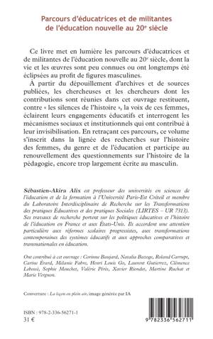 Ce livre met en lumière les parcours d'éducatrices et de militantes de l'éducation nouvelle au 20e siècle, dont la vie et les oeuvres sont peu connues ou ont longtemps été éclipsées au profit de figures masculines. À partir du dépouillement d'archives et de sources publiées, les chercheuses et les chercheurs dont les contributions sont réunies dans cet ouvrage restituent, contre les silences de l'histoire, la voix de ces femmes, éclairent leurs engagements éducatifs et interrogent les mécanismes sociaux et institutionnels qui ont contribué à leur invisibilisation. En retraçant ces parcours, ce volume s'inscrit dans la lignée des recherches sur l'histoire des femmes, du genre et de l'éducation et participe au renouvellement des questionnements sur l'histoire de la pédagogie, encore trop largement écrite au masculin.