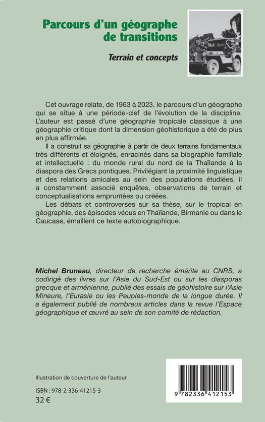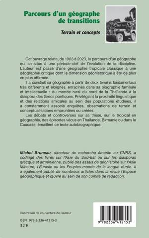 Cet ouvrage relate, de 1963 à 2023, le parcours d’un géographe qui se situe à une période-clef de l’évolution de la discipline. L’auteur est passé d’une géographie tropicale classique à une géographie critique dont la dimension géohistorique a été de plus en plus affirmée. Il a construit sa géographie à partir de deux terrains fondamentaux très différents et éloignés, enracinés dans sa biographie familiale et intellectuelle : du monde rural du nord de la Thaïlande à la diaspora des Grecs pontiques. Privilégiant la proximité linguistique et des relations amicales au sein des populations étudiées, il a constamment associé enquêtes, observations de terrain et conceptualisations empruntées ou créées. Les débats et controverses sur sa thèse, sur le tropical en géographie, des épisodes vécus en Thaïlande, Birmanie ou dans le Caucase, émaillent ce texte autobiographique.