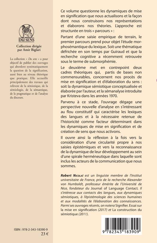 Ce volume questionne les dynamiques de mise en signification que nous actualisons et la façon dont nous construisons nos représentations et élaborons nos théories. L'approche est structurée en trois "parcours" : Partant d'une saisie empirique de terrain, le premier parcours prend l'objet d'étude morphosémantique du lexique. Le deuxième met en contrepoint deux cadres théoriques, qui, partis de bases non commensurables, concernent nos procès de mise en signification et d'élaboration du sens. Parvenu à ce stade, l'ouvrage dégage une perspective nouvelle d'analyse en s'intéressant au flou constitutif qui caractérise les lexiques des langues et à la nécessaire retenue de l'historicité comme facteur déterminant dans les dynamiques de mise en signification et de création de sens que nous activons.