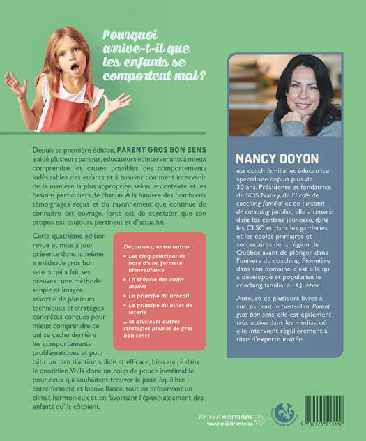 Depuis sa première édition, Parent gros bon sens a aidé plusieurs parents, éducateurs et intervenants à mieux comprendre les causes possibles des comportements indésirables des enfants et à trouver comment intervenir de la manière la plus appropriée selon le contexte et les besoins particuliers de chacun. À la lumière des nombreux témoignages reçus et du rayonnement que continue de connaître cet ouvrage, force est de constater que son propos est toujours pertinent et d’actualité. Cette nouvelle édition revue et mise à jour présente donc la même « méthode gros bon sens » qui a fait ses preuves : une méthode simple et imagée, assortie de plusieurs techniques et stratégies concrètes conçues pour mieux comprendre ce qui se cache derrière les comportements problématiques et pour bâtir un plan d’action solide et efficace, bien ancré dans le quotidien. Voilà donc un coup de pouce inestimable pour ceux qui souhaitent trouver le juste équilibre entre fermeté et bienveillance, tout en préservant un climat harmonieux et en favorisant l’épanouissement des enfants qu’ils côtoient.