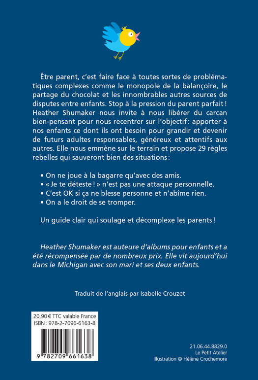 Heather Shumaker nous invite à nous libérer du carcan bien-pensant pour nous recentrer sur l’objectif : apporter à nos enfants ce dont ils ont besoin pour grandir et devenir de futurs adultes responsables, généreux et attentifs aux autres. Elle nous emmène sur le terrain et propose 29 règles rebelles qui sauveront bien des situations :