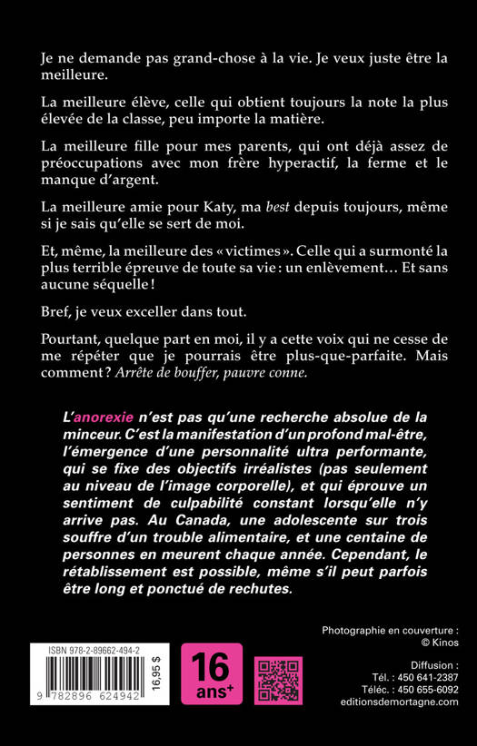 Je ne demande pas grand-chose à la vie. Je veux juste être la meilleure. La meilleure élève, celle qui obtient toujours la note la plus élevée de la classe, peu importe la matière. La meilleure fille pour mes parents, qui ont déjà assez de préoccupations avec mon frère hyperactif, la ferme et le manque d’argent. La meilleure amie pour Katy, ma best depuis toujours, même si je sais qu’elle se sert de moi. Et, même, la meilleure des « victimes ». Celle qui a surmonté la plus terrible épreuve de toute sa vie : un enlèvement… Et sans aucune séquelle ! Bref, je veux exceller dans tout. Pourtant, quelque part en moi, il y a cette voix qui ne cesse de me répéter que je pourrais être plus-que-parfaite. Mais comment ? Arrête de bouffer, pauvre conne. L’histoire d’Annie est basée sur un fait vécu. L’anorexie n’est pas qu’une recherche absolue de la minceur. C’est la manifestation d’un profond mal-être, l’émergence d’une personnalité ultra performante, qui se fixe des objectifs irréalistes (pas seulement au niveau de l’image corporelle), et qui éprouve un sentiment de culpabilité constant lorsqu’elle n’y arrive pas. Au Canada, une adolescente sur trois souffre d’un trouble alimentaire, et une centaine de personnes en meurent chaque année. Les causes de l’anorexie sont nombreuses et complexes, voire insidieuses, ce qui la rend difficile à prévenir. Cependant, le rétablissement est possible, même s’il peut parfois être long et ponctué de rechutes.