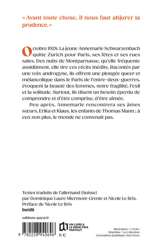 Octobre 1928. La jeune Annemarie Schwarzenbach quitte Zurich pour Paris, ses fêtes et ses rues sales. Des nuits de Montparnasse, qu'elle fréquente assidûment, elle tire ces récits inédits. Racontés par une voix androgyne, ils offrent une plongée queer et mélancolique dans le Paris de l'entre-deux-guerres, évoquent la beauté des femmes, notre fragilité, l'exil et la solitude. Surtout, ils disent un besoin éperdu de comprendre et d'être comprise, d'être aimée. Peu après, Annemarie rencontrera ses âmes soeurs, Erika et Klaus, les enfants de Thomas Mann ; à eux non plus, le monde ne convenait pas.
