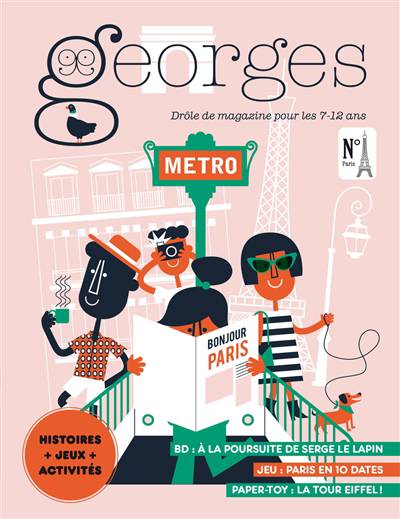Avec ce nouveau numéro, Georges a réussi son Paris : mêler des histoires, des jeux et des activités pour en savoir plus sur la capitale, tout en s’amusant !Au sommaire : Partie 1, des HISTOIRES : - Une grande BD où l’on suit Serge, vous savez le lapin rose du métro parisien qui dit « Ne met pas pas tes mains sur les portes, tu risques de te faire pincer très fort » ! Une aventure souterraine signée Emilie Clarke ; - Un nouveau tuto de Cagoule et Lapin, par Anne-Sophie Constancien, où Lapin cherche la tenue idéale pour visiter la capitale de la mode ; - l’histoire vraie d’un bon ami de Dumbledore… Nicolas Flamel qui est à l’origine, avec sa femme Dame Pernelle, de la première maison construite à Paris, destinée à nourrir les plus pauvres. Écrite par Rozenn Le Berre et illustrée par Fabien Roché. Partie 2, des JEUX avec : - un voyage dans le temps, de Lutèce aux J.O. 2024, en passant par les travaux du baron Haussmann, voici Paris en 10 dates ! ; - une carte pour repérer les monuments et suivre « l’escargot » des arrondissements ; - un jeu des différences sur le quai du métropolitain mais aussi des mots croisés et des jeux à décoder pour découvrir la Ville Lumière ! Un PAPER-TOY en forme de Tour Eiffel ! Partie 3, des ACTIVITÉS : - GRAPHISME : s’exercer à la caricature, comme à Montmartre ; - CUISINE : préparer une délicieuse recette asiatique en provenance du 13e arrondissement ; - BRICOLAGE : fabriquer son panneau de rue bleu et vert ; - SCIENCE : tester l’électricité statique, comme au Palais de la Découverte ! Sans oublier les chroniques de livres, un reportage auprès d’un gardien de nuit au musée du Louvre et le quiz final… Voici un numéro CAPITAL pour l’été !