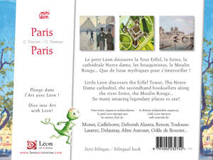 â¢âLe petit Léon visite Paris. Il découvre la Tour Eiffel, la Seine, la cathédrale Notre-dame, les bouquinistes, le Moulin Rouge... Que de lieux mythiques pour s’émerveiller en compagnie du petit caméléon !<br /> â¢âLéon, le héros de la collection Mini Léon, interagit de façon originale et ludique avec treize oeuvres d’art d’époques et de cultures variées. Chaque interaction est soulignée par une phrase en Français et en Anglais. <br /> â¢âMonet, Caillebotte, Deborah Alastra, Renoir, Toulouse-Lautrec, Delaunay, Signac, Aline Aurouet, Odile de Bouvier...<br />