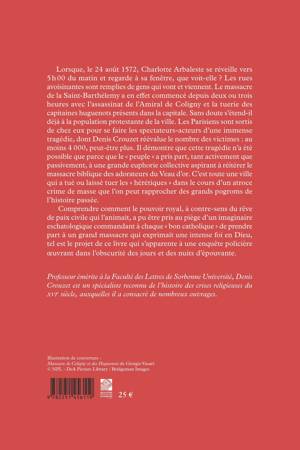 Lorsque, le 24 août 1572, Charlotte Arbaleste se réveille vers 5 h 00 du matin et regarde à sa fenêtre, que voit-elle ? Les rues avoisinantes sont remplies de gens qui vont et viennent. Le massacre de la Saint-Barthélemy a en effet commencé depuis deux ou trois heures avec l’assassinat de l’Amiral de Coligny et la tuerie des capitaines huguenots présents dans la capitale. Sans doute s’étend-il déjà à la population protestante de la ville. Les Parisiens sont sortis de chez eux pour se faire les spectateurs-acteurs d’une immense tragédie, dont Denis Crouzet réévalue le nombre des victimes : au moins 4 000, peut-être plus. Il démontre que cette tragédie n’a été possible que parce que le « peuple » a pris part, tant activement que passivement, à une grande euphorie collective aspirant à réitérer le massacre biblique des adorateurs du Veau d’or. C’est toute une ville qui a tué ou laissé tuer les « hérétiques » dans le cours d’un atroce crime de masse que l’on peut rapprocher des grands pogroms de l’histoire passée.