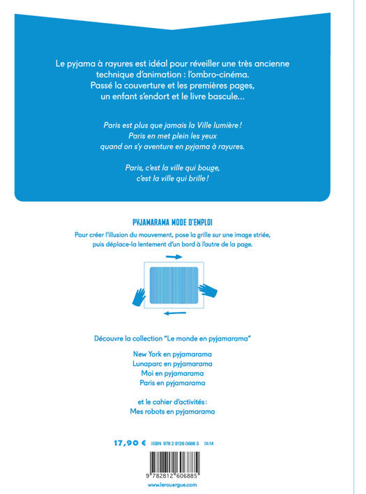 Le pyjama à rayures est idéal pour réveiller une très ancienne technique de l'animation : l'ombro-cinéma. Passées la couverture et les premières pages, un enfant s'endort ; le livre bascule aussi ... Après New-York, le "PYJAMARAMA" visite une nouvelle ville capitale. Cette fois il s'agit de Paris. Paris qui scintille au passage de la grille est plus que jamais la ville lumière, on découvre aussi bien le « Moulin Rouge » que les bateaux mouches, avec un clin d'oeil obligé à la façade en diaphragmes de l'institut du monde arabe, un passage incontournable devant le centre Pompidou et la fontaine Stravinsky etc. Sur le plan vertical, une histoire illustrée par Frédérique Bertrand répond aux images horizontales et "tactiles" de Michaël Leblond : des graphismes qui s'animent avec magie au simple