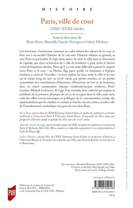 Les historiens s’intéressant rarement au cadre urbain des séjours de la cour, ce livre vise à réconcilier l’histoire de la cour avec l’histoire urbaine en général, et avec Paris en particulier. Il s’agit alors moins de saisir la ville dans sa dimension de capitale, que dans sa fonction de «ville de résidence», pour isoler le facteur curial de l’équation urbaine. Parce qu’il y a une vraie diffculté à penser le rapport entre Paris et la cour –au Moyen Âge parce qu’elle est itinérante, à l’époque moderne à cause de Versailles– le livre explore les liens entre la ville et la cour sur le temps long, du e au esiècle, par petites touches, en six parties rassemblant des contributions d’historiens, d’historiens de l’art et de littéraires, dans un esprit comparatiste (époque médiévale/époque moderne, Paris/Londres-Madrid-Lisbonne). Il s’agit d’un véritable livre collectif qui explore le problème de la présence physique du roi et de ses gens dans la ville, mais aussi celui des effets socioéconomiques et politiques de la consommation curiale, des représentations que les citadins et curiaux se font les uns des autres, et enfin celle de l’investissement symbolique des gens de cour dans Paris.