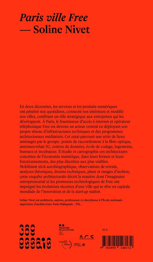 En deux décennies, les services et produits numériques â¨ont pénétré nos quotidiens, connecté nos intérieurs et modifiéâ¨nos villes, conférant un rôle stratégique aux entreprises qui les développent. À Paris, le fournisseur d'accès à internet et opérateur téléphonique Free est devenu un acteur central en déployant son propre réseau d'infrastructures techniques et des programmes architecturaux médiatisés. Cet essai parcourt une série de lieux aménagés par Free. Il étudie et cartographie ces architectures concrètes de l'économie numérique, dans leurs formes et leurs fonctionnements, des plus discrètes aux plus visibles.⨠Mobilisant récit autobiographique, observations de terrain, analyses théoriques, dessins techniques, plans et images d'archive, cette enquête architecturale décrit la manière dont l'imaginaire entrepreneurial et les promesses technologiques de Free ont imprégné les évolutions récentes d'une ville qui se rêve en capitale mondiale de l'innovation et de la start-up nation.